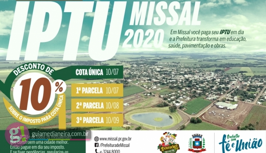 Logo nos primeiros dias em que foram adotadas medidas de enfrentamento ao novo Coronavírus, o município de Missal prorrogou o prazo de pagamento do IPTU 2020. Devido a essa prorrogação, quem havia retirado as guias com a data anterior, devem solicitar nova guia para pagamento. Basta acessar o site da Prefeitura (www.missal.pr.gov.br)), na aba IPTU 2020.