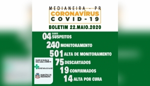 Até a manhã desta sexta-feira (22) temos 240 pessoas em monitoramento domiciliar, destas 04 apresentam sintomas e estão sendo tratadas como casos suspeitos. Dos 19 casos confirmados da Covid-19 em Medianeira, 14 já cumpriram o isolamento domiciliar, estão assintomáticos e recuperados, 03 estão em isolamento domiciliar, 02 pacientes estão na Uti.