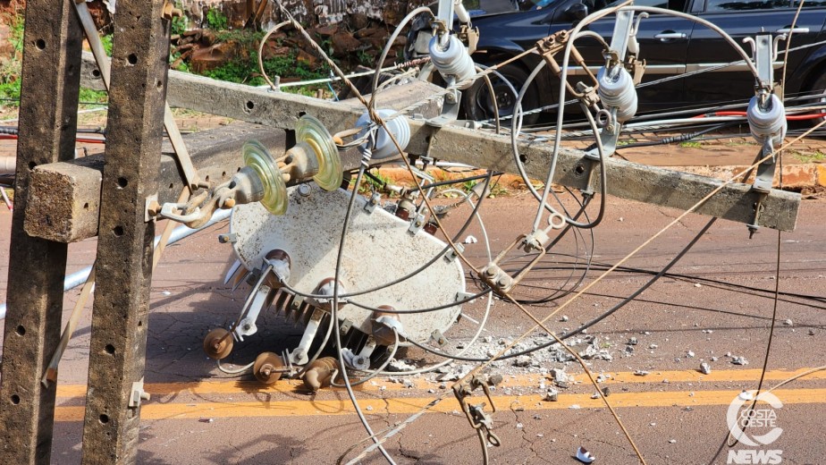 Poste cai após colisão de veículo na rua Alfredo Chaves em São Miguel do Iguaçu; trânsito está interditado