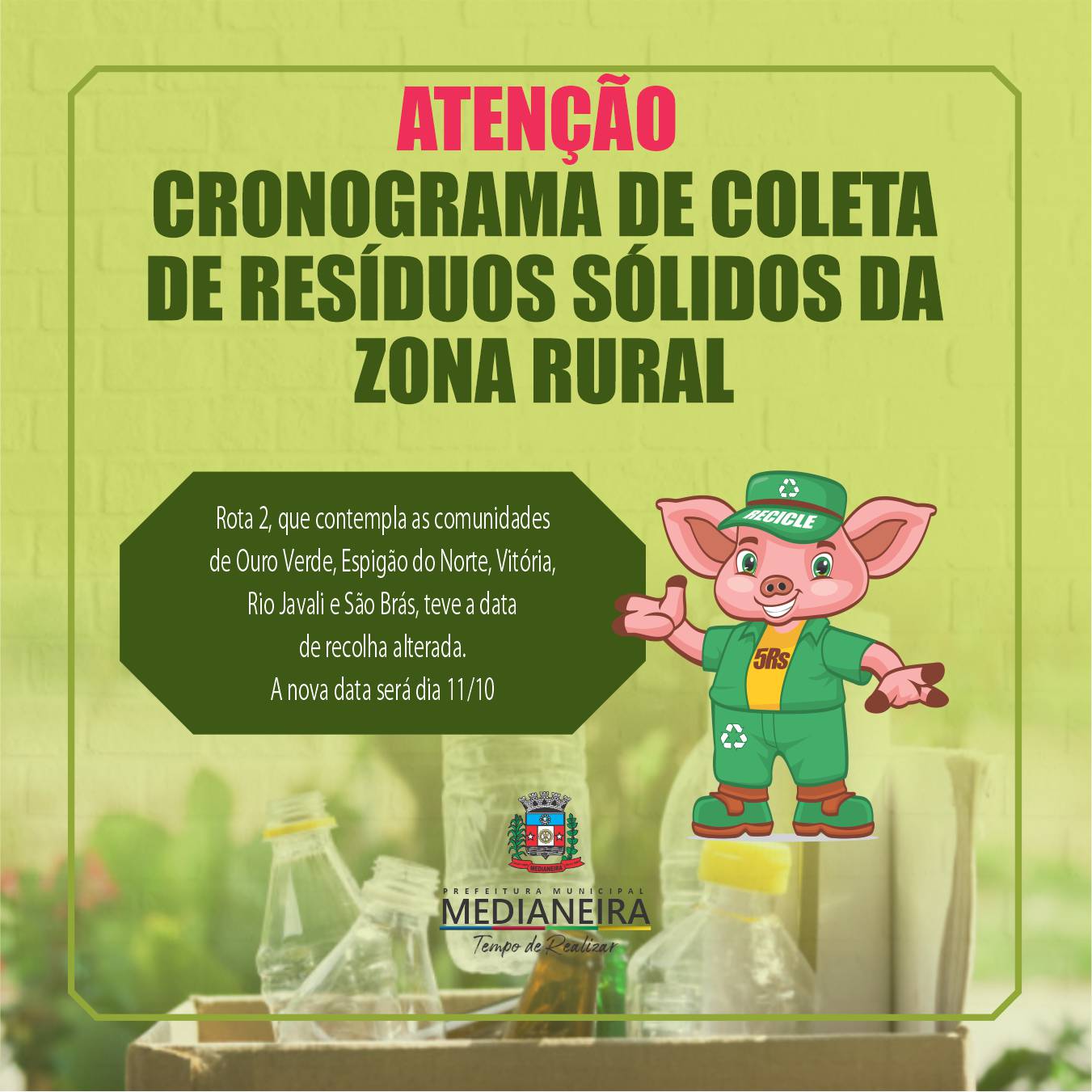 A Secretaria de Agricultura comunica aos moradores das comunidades Ouro Verde, Espigão do Norte, Vitória, Javali e São Brás, que fazem parte da Rota 2 da Coleta de Recicláveis da Zona Rural, que a recolha que seria realizada nesta terça-feira (03) será transferia para a próxima semana, sendo realizada na quarta-feira (11).