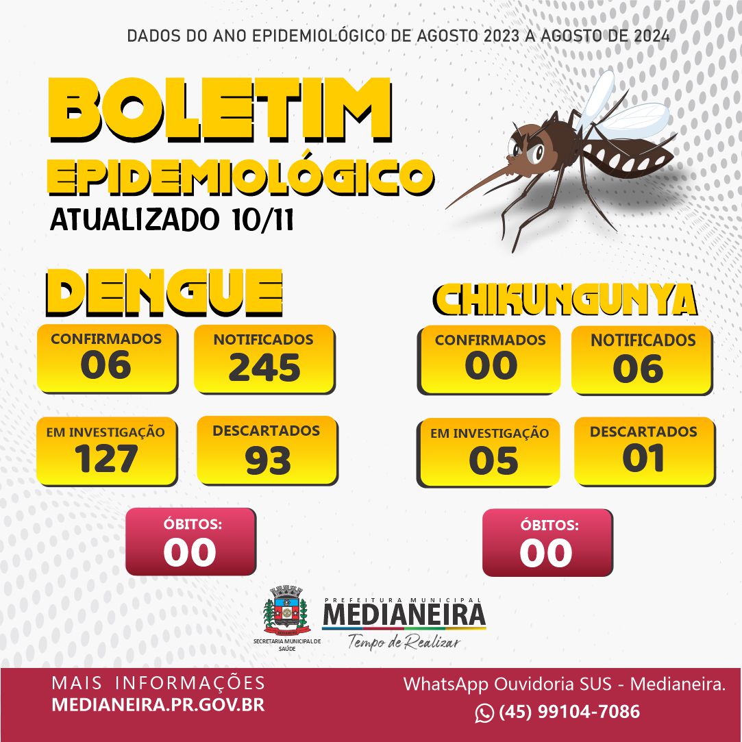 DENGUE: O município registrou até o momento 245 notificações, 06 foram confirmadas, 127 foram descartados e 112 estão em investigação.