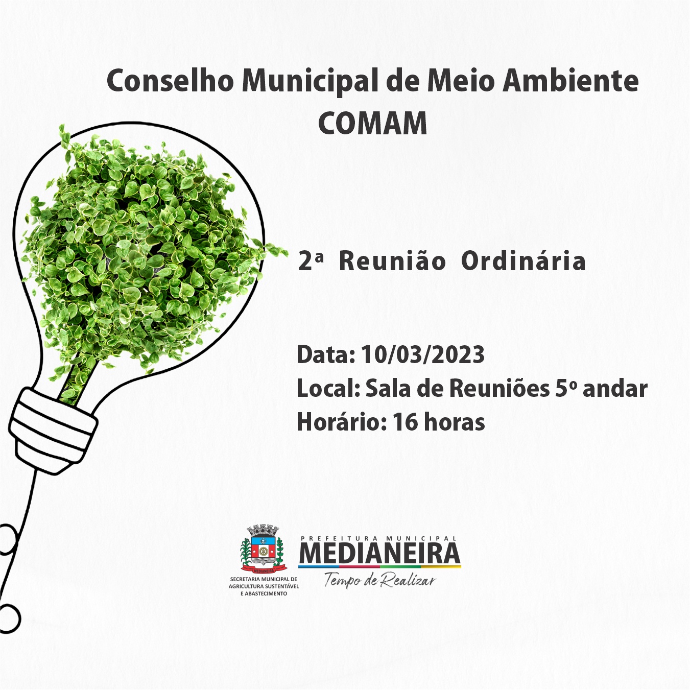 Conselho Municipal de Meio Ambiente (COMAM) realiza nesta sexta-feira (10) a segunda Reunião Ordinária, na sala de reuniões do 5º piso da prefeitura às 16 horas, e é aberta ao público.