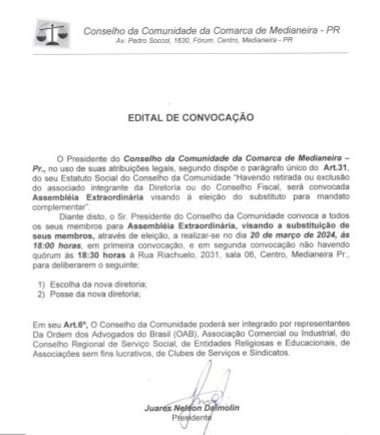 O Conselho da Comunidade da Comarca de Medianeira, com sede na Av. Pedro Soccol, 1630, anexo ao Fórum, publicou edital para convocação de seus membros para Assembleia Geral Extraordinária e eleição da sua diretoria.