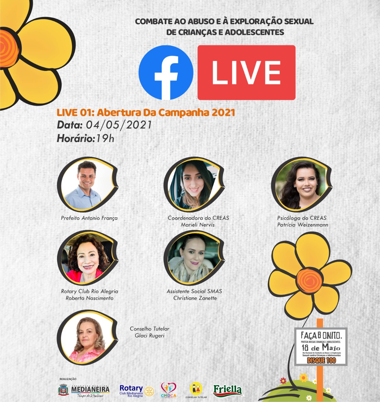 A abertura da programação virtual será nesta terça-feira (04) às 19 horas através do facebook da prefeitura (https://www.facebook.com/PrefeituradeMedianeira), com a participação do prefeito Antonio França, a coordenadora do CREAS Marieli Nervis, a psicóloga Patrícia Weizenmann, a diretora da SMAS Christiane Zanette, a conselheira tutelar Glaci Rugeri e Roberta Nascimento do Rotary Rio Alegria, apoiador da causa.