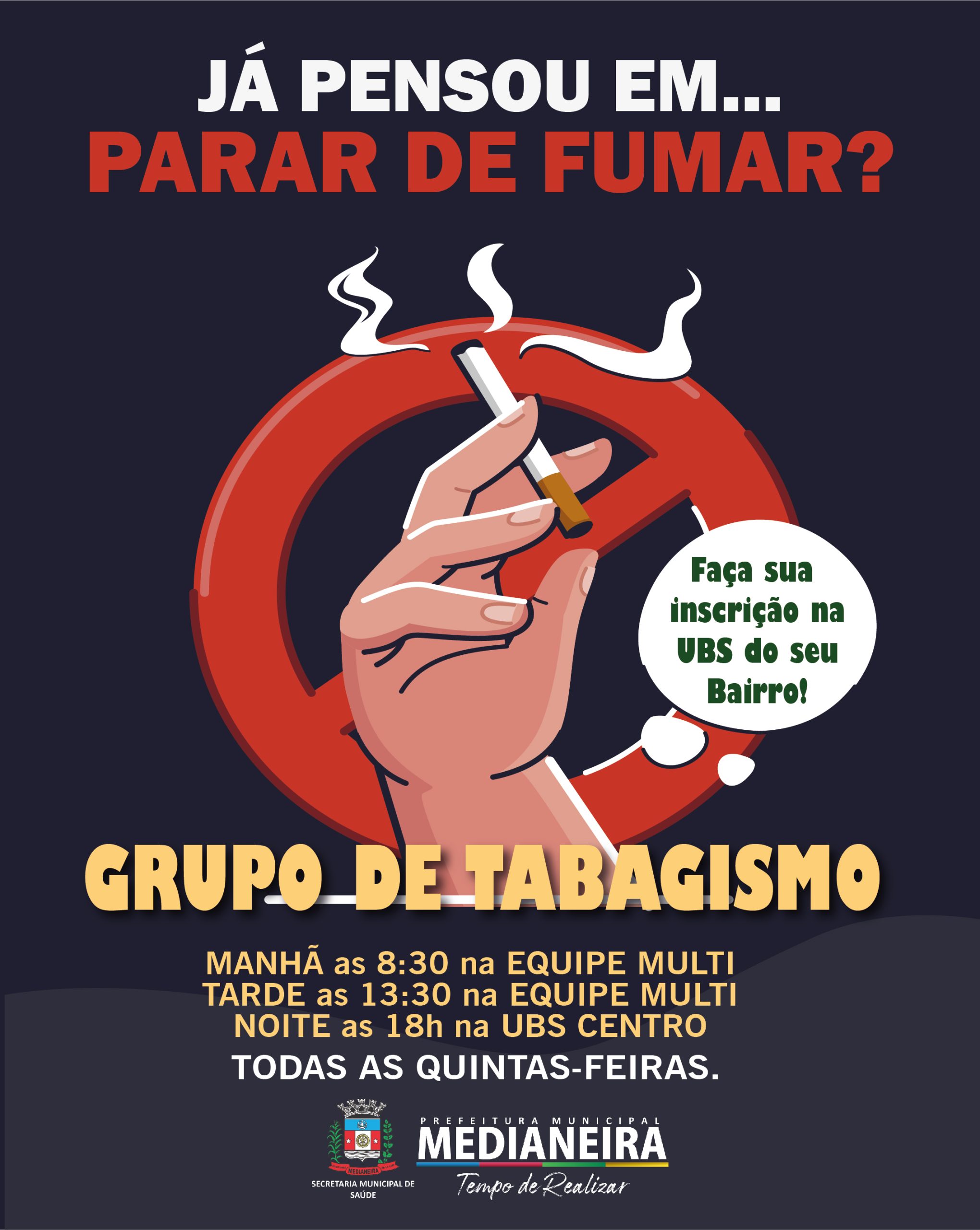 A Secretaria de Saúde, através da Equipe Multiprofissional, informa a abertura de novos horários do Grupo de Tabagismo com intuito de facilitar o acesso da população em diferentes turnos.