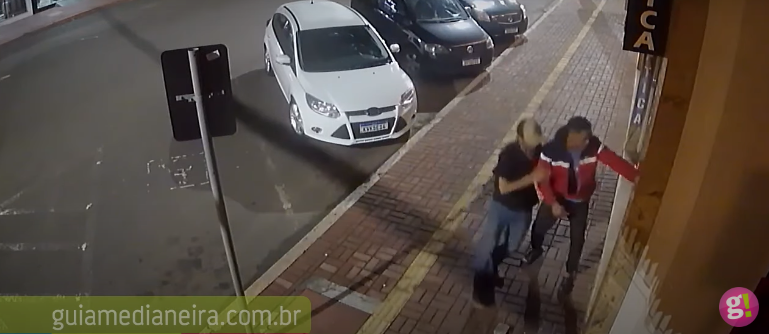Imagens de câmeras de monitoramento mostram a ação dos dois marginais, que chegam ao local e um deles arremessa uma pedra na vitrine, e então corre em direção à esquina com a Rua Argentina.