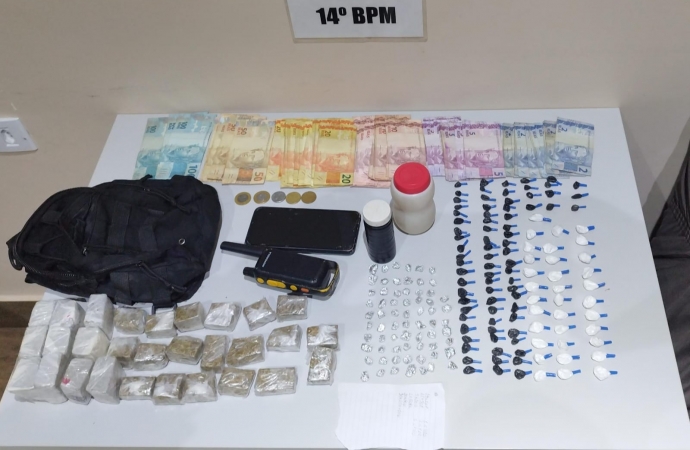 O autor, as drogas, o dinheiro e o rádio comunicador foram encaminhados à delegacia de polícia civil para as devidas providências. Segundo a polícia, foram apreendidos 29 “tacos” de maconha (669g), 67 “pedras” de crack (20g), 110 “buchas” de cocaína (34g), uma “bucha” de haxixe, um celular e um rádio comunicador. O homem foi preso em flagrante por tráfico de drogas.