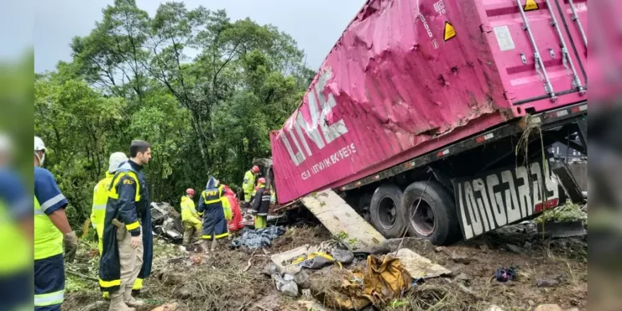 As vítimas fatais estavam todas na van, que foi brutalmente esmagada pela carreta, que transportava um container com peças automotivas. O acidente ocorreu no km 665 da rodovia, na pista sentido Santa Catarina.