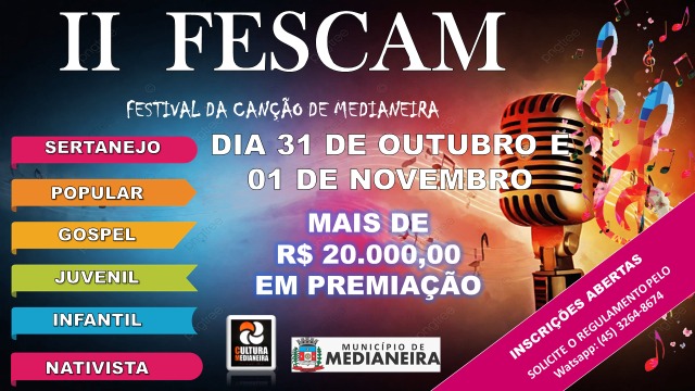 O FESCAM é o Festival Municipal de Interpretação, que abrange as categorias de música Popular, Sertaneja, Gospel, Juvenil e Infantil. A 2ª edição acontece de 31 de outubro e 01 de novembro, no Centro Popular de Cultura Arandurá, em Medianeira.